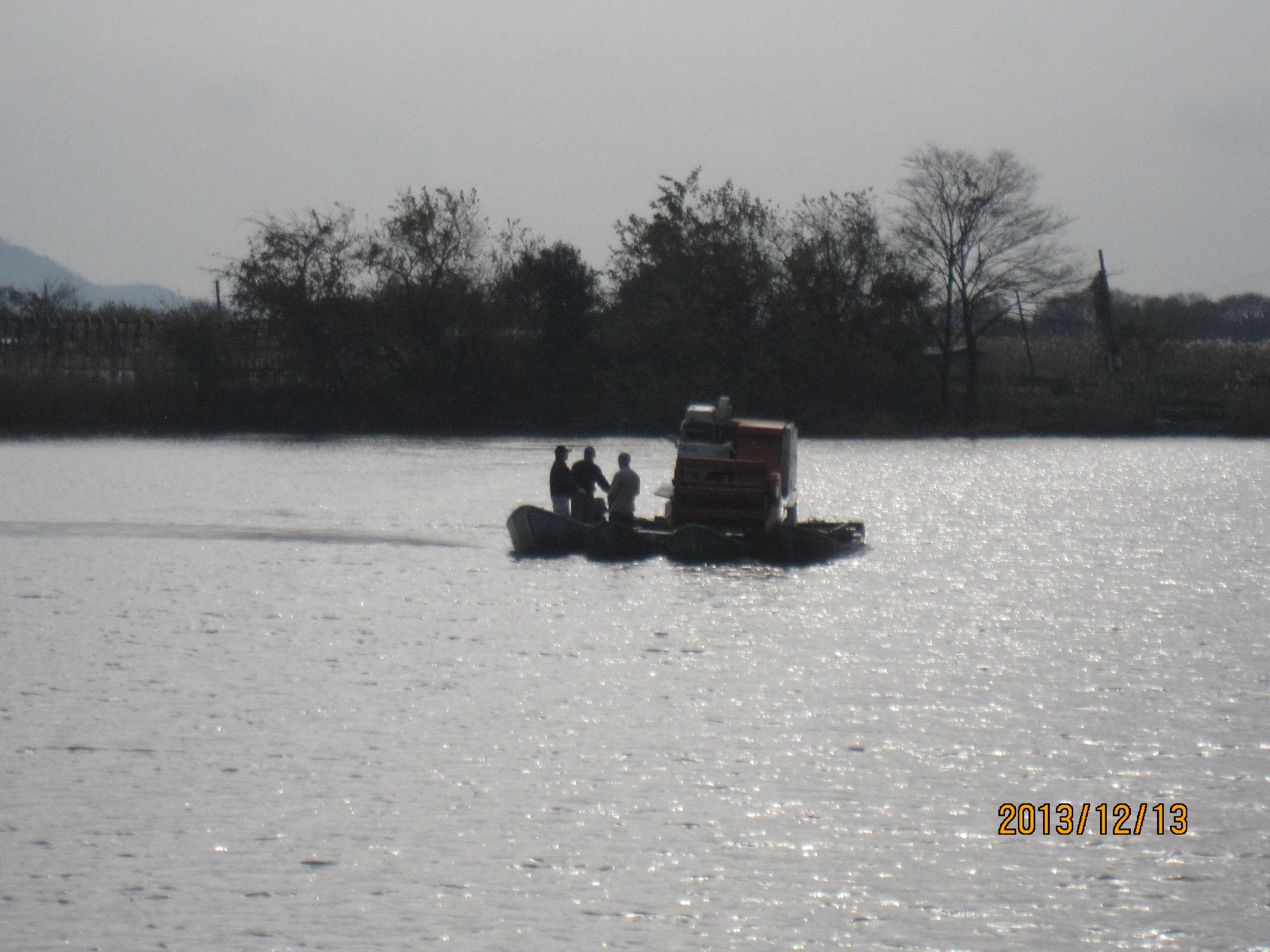 遠くに見えるのは権座で収穫を終えたコンバインを本土に戻す作業風景
